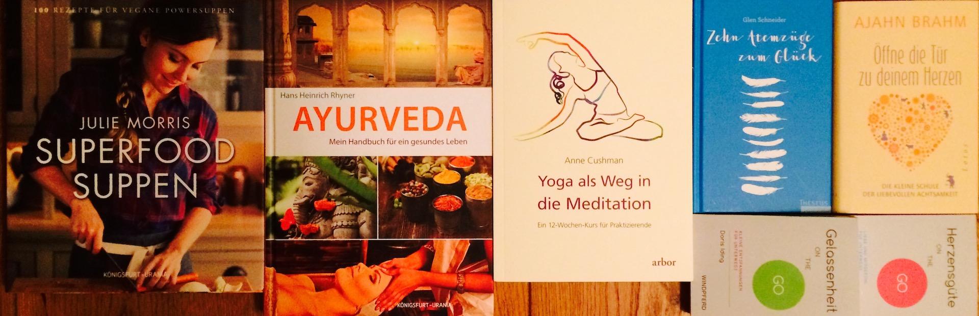 +++ "Vegan kochen und backen" von Björn Moschinski +++ "Yoga Inspiration" von Kerstin Huber-Steinhorst +++ "WaldYoga" von Verena Krutak +++ "Komm, wir machen Yoga" von Sonja Zernick-Förster +++ "achtsam essen - achtsam leben" von Thich Nhat Hanh +++