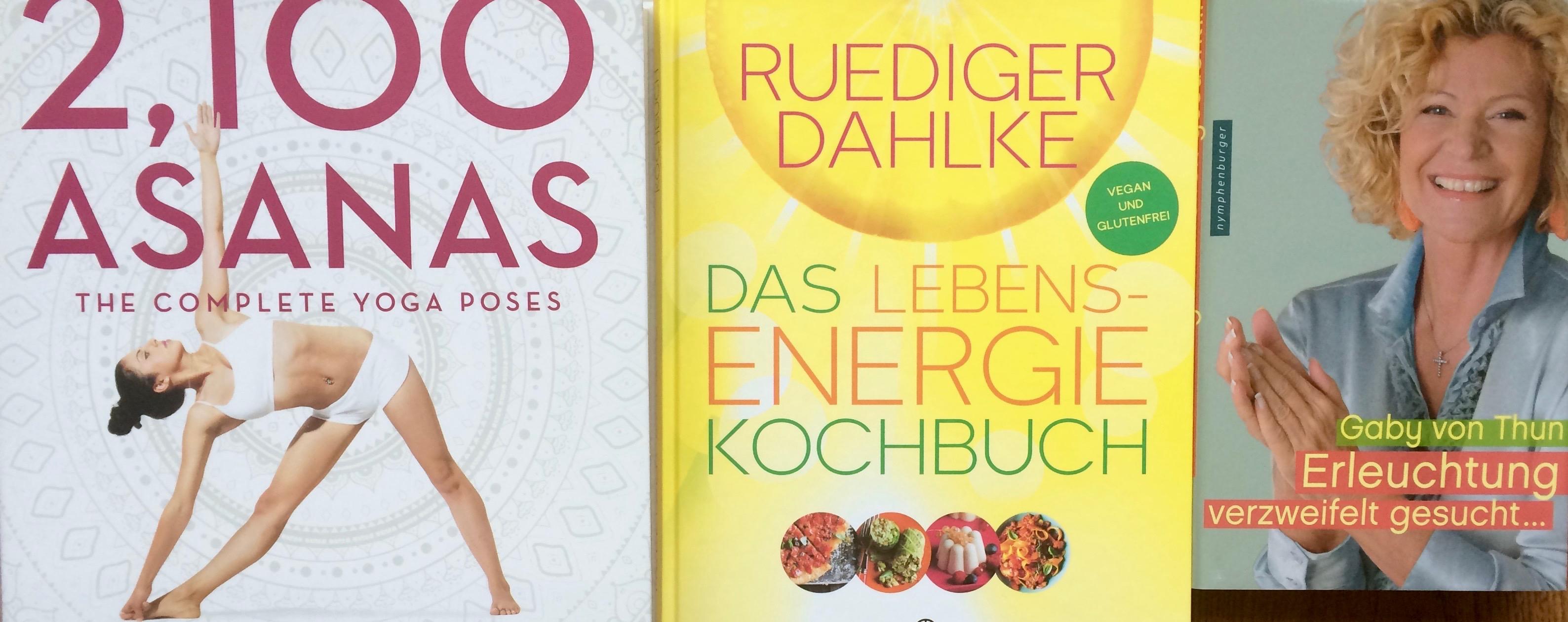 Ein wahres Gedicht und "Must Have" für jeden Yogi: "2100 Asanas"von Daniel Lacerda. Momentan nur auf Englisch erhältlich, nächstes Jahr wird es auf Deutsch erscheinen. Aber wer nicht solange warten kann, wird reichhaltig belohnt: Es gibt nicht unbedingt viele Anleitungen, aber tolle Fotos mit schier unendlichen Variationen von bekannten und weniger bekannten Asanas. Eine Inspirationsquelle ohne gleichen! Für alle Ruediger Dahlke Fans: "Das Lebensenergie-Kochbuch: Vegan und glutenfrei", womit der bekannte Arzt und Psychotherapeut (mit Zusatzausbildung zum Arzt für Naturheilweisen und Homöopathie) natürlich voll im Trend liegt. Gaby von Thuns "Erleuchtung verzweifelt gesucht" ist eine vielleicht nicht ganz neue, aber recht amüsante Sinnsuche mit allerlei Episoden aus dem spiritullen Zauberkasten. Eine schöne Lektüre für de Ostertage.